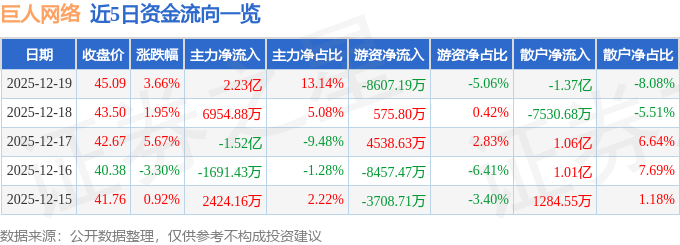 证券之星消息,截至2025年12月19日收盘,巨人网络(002558)报收于45.09元,上涨3.66%,换手率1.97%,成交量38.13万手,成交额17.0亿元。