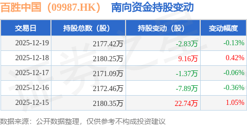 证券之星消息,12月19日南向资金减持2.83万股百胜中国(09987.HK)。近5个交易日中,获南向资金增持的有2天,累计净增持19.81万股。近20个交易日中,获南向资金增持的有10天,累计净增持19.22万股。截至目前,南向资金持有百胜中国(09987.HK)2177.42万股,占公司已发行普通股的6.11%。