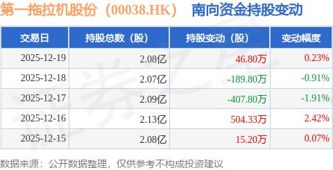 证券之星消息,12月19日南向资金增持46.8万股第一拖拉机股份(00038.HK)。近5个交易日中,获南向资金减持的有2天,累计净减持31.27万股。近20个交易日中,获南向资金减持的有9天,累计净减持31.19万股。截至目前,南向资金持有第一拖拉机股份(00038.HK)2.08亿股,占公司已发行普通股的53.03%。