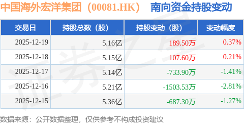 证券之星消息,12月19日南向资金增持189.5万股中国海外宏洋集团(00081.HK)。近5个交易日中,获南向资金减持的有3天,累计净减持2627.63万股。近20个交易日中,获南向资金减持的有7天,累计净减持1579.7万股。截至目前,南向资金持有中国海外宏洋集团(00081.HK)5.16亿股,占公司已发行普通股的14.5%。