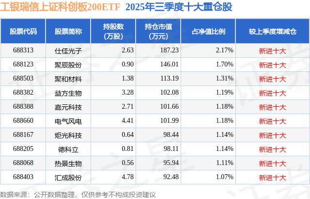 工银瑞信上证科创板200ETF基金成立于2025年7月23日,基金经理为何顺,基金跟踪标的为上证科创板200指数,成立以来超额回报为-7.92%,近一个月超额回报为-0.32%。最新披露的基金持仓数据显示,截止2025年9月30日,该基金第一大重仓股为仕佳光子(688313),持股占比为2.17%。