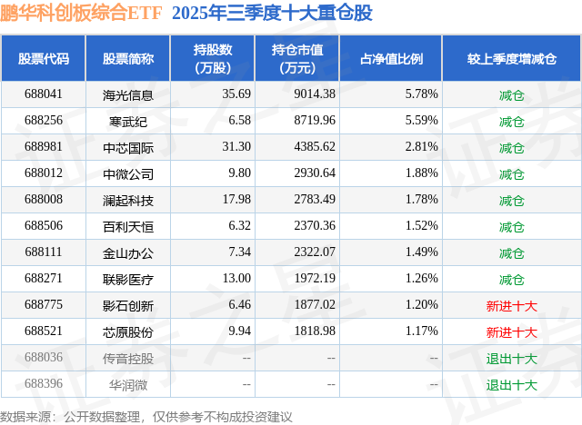 鹏华科创板综合ETF基金成立于2025年2月26日,基金经理为苏俊杰,基金跟踪标的为上证科创板综合指数,成立以来超额回报为-0.24%,近一个月超额回报为-0.04%。最新披露的基金持仓数据显示,截止2025年9月30日,该基金第一大重仓股为海光信息(688041),持股占比为5.78%。