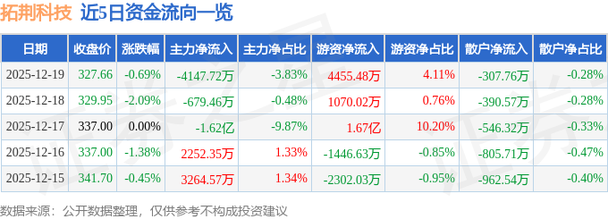 证券之星消息,截至2025年12月19日收盘,拓荆科技(688072)报收于327.66元,下跌0.69%,换手率1.18%,成交量3.31万手,成交额10.84亿元。