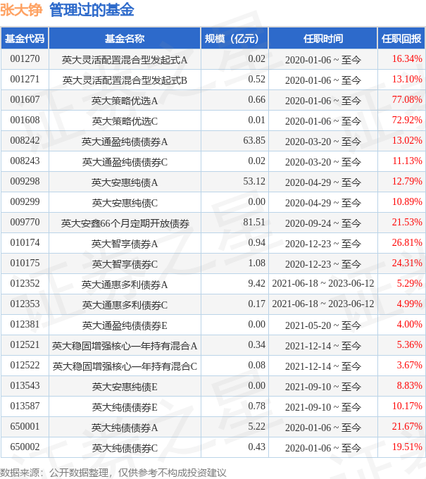 张大铮先生:香港中文大学工商管理硕士。历历任中银国际证券有限责任公司高级分析员,中国国际金融有限公司固定收益部副总经理、资产管理部副总经理,摩根士丹利华鑫基金管理有限公司助理总经理、固定收益投资部总监,民生基金管理有限公司(筹)副总裁,英大基金管理有限公司总经理助理(投资总监)兼固定收益部总经理、基金经理,英大基金管理有限公司固定收益部总经理(兼任)。2019年5月加入英大基金,现任副总经理兼党总支委员、基金经理,英大纯债债券型证券投资基金、英大灵活配置混合型发起式证券投资基金、英大策略优选混合型证券投资基金、英大通盈纯债债券型证券投资基金、英大安惠纯债债券型证券投资基金、英大安鑫66个月定期开放债券型证券投资基金、英大智享债券型证券投资基金的基金经理。曾任英大通惠多利债券型证券投资基金基金经理。