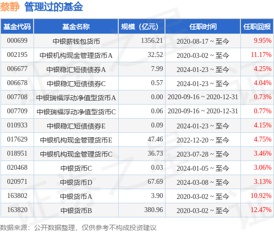 蔡静先生:硕士研究生,曾任兴业银行总行计划财务部交易经理。2019年加入中银基金管理有限公司。2020年3月2日任中银机构现金管理货币市场基金基金经理。2020年3月2日任中银货币市场证券投资基金基金经理。2020年8月17日起担任中银薪钱包货币市场基金基金经理。2024年1月23日任中银稳汇短债债券型证券投资基金基金经理。