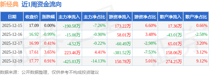 资金流向数据方面,本周新经典主力资金合计净流出411.68万元,游资资金合计净流出59.99万元,散户资金合计净流入471.67万元。本周资金流向一览见下表: