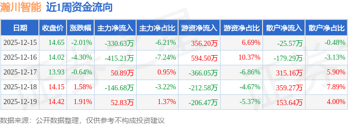 资金流向数据方面,本周瀚川智能主力资金合计净流出788.8万元,游资资金合计净流入165.6万元,散户资金合计净流入623.21万元。本周资金流向一览见下表: