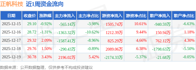 资金流向数据方面,本周正帆科技主力资金合计净流出1610.29万元,游资资金合计净流入3458.13万元,散户资金合计净流出1847.84万元。本周资金流向一览见下表: