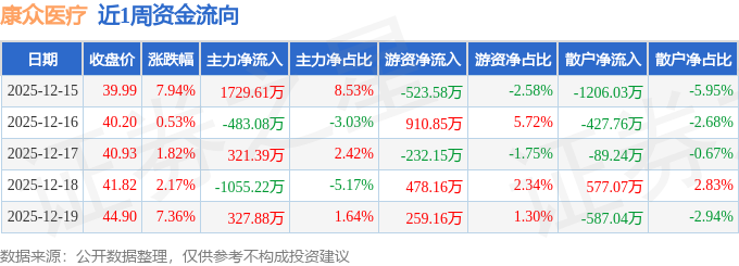 资金流向数据方面,本周康众医疗主力资金合计净流入840.57万元,游资资金合计净流入892.43万元,散户资金合计净流出1733.0万元。本周资金流向一览见下表: