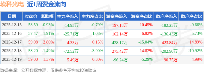 资金流向数据方面,本周埃科光电主力资金合计净流出103.33万元,游资资金合计净流入110.32万元,散户资金合计净流出6.99万元。本周资金流向一览见下表: