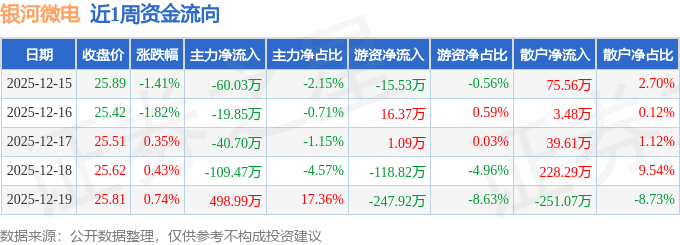 资金流向数据方面,本周银河微电主力资金合计净流入268.93万元,游资资金合计净流出364.82万元,散户资金合计净流入95.88万元。本周资金流向一览见下表: