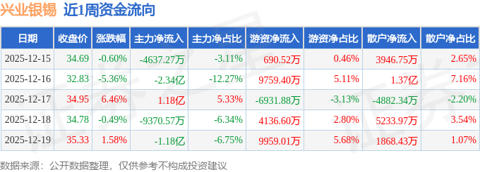 资金流向数据方面,本周兴业银锡主力资金合计净流出3.74亿元,游资资金合计净流入1.76亿元,散户资金合计净流入1.98亿元。本周资金流向一览见下表: