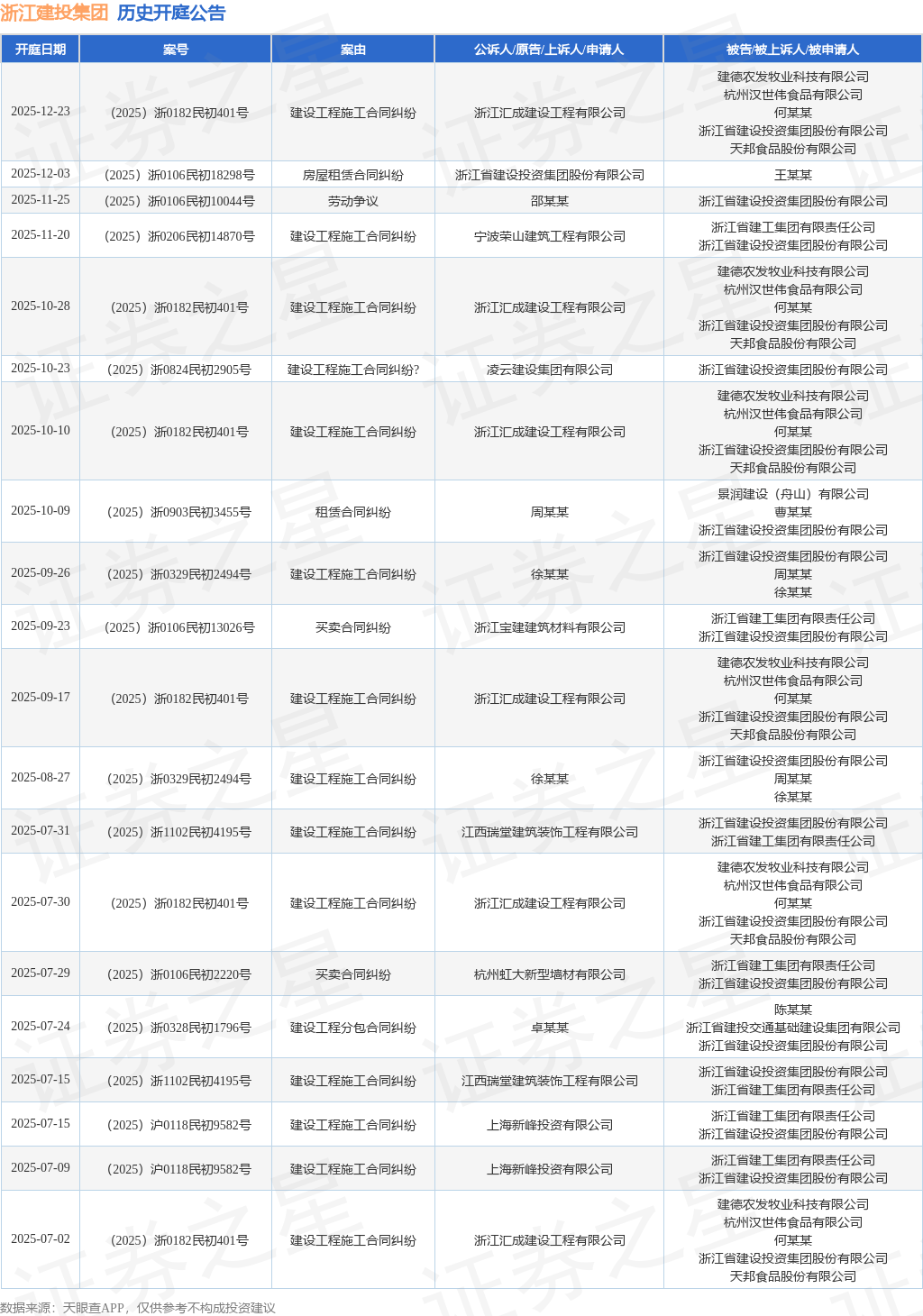 案号:(2025)浙0182民初401号根据统计,近一年内以浙江省建设投资集团股份有限公司为当事人的历史开庭公告有38则,其中案由为“建设工程施工合同纠纷”的公告以13则居首,其次为“买卖合同纠纷”有9则,“租赁合同纠纷”有4则。历史开庭公告(前20条)如下: