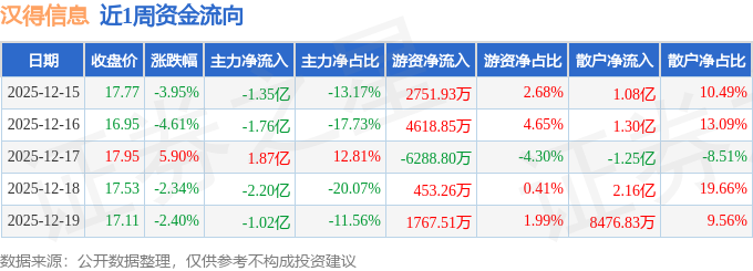 资金流向数据方面,本周汉得信息主力资金合计净流出4.47亿元,游资资金合计净流入3302.75万元,散户资金合计净流入4.14亿元。本周资金流向一览见下表: