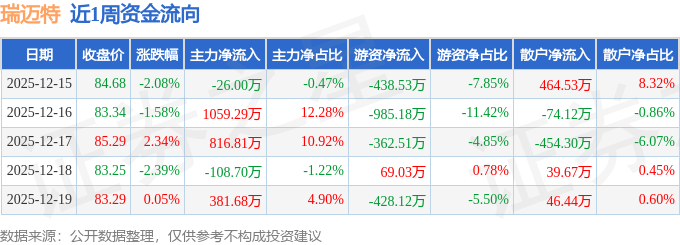 资金流向数据方面,本周瑞迈特主力资金合计净流入2123.08万元,游资资金合计净流出2145.31万元,散户资金合计净流入22.23万元。本周资金流向一览见下表: