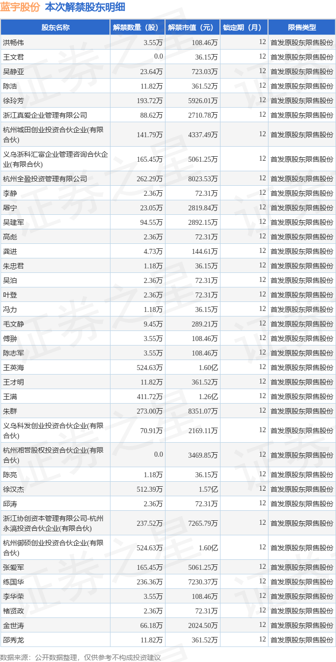 证券之星消息,根据市场公开信息整理,蓝宇股份(301585)于12月22日将有4210.89万股限售股份解禁,为公司首发原股东限售股份,占公司总股本40.49%。(本次数据根据历史公告整理得出,实际情况以上市公司最新公告为准)最近一年内,该股累计解禁134.45万股,占总股本的1.29%。本次解禁后,公司还有3589.11万股限售股份,占总股本34.51%。具体如下图所示: