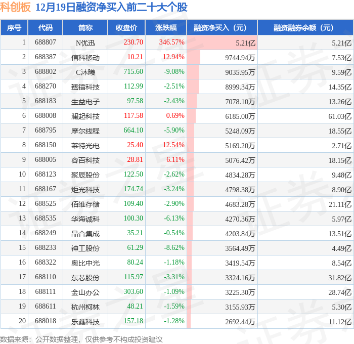 科创板融资净买入前三分别为:N优迅(688807)融资净买入5.21亿元、信科移动(688387)融资净买入9744.94万元、C沐曦(688802)融资净买入9035.95万元,前20具体见下表: