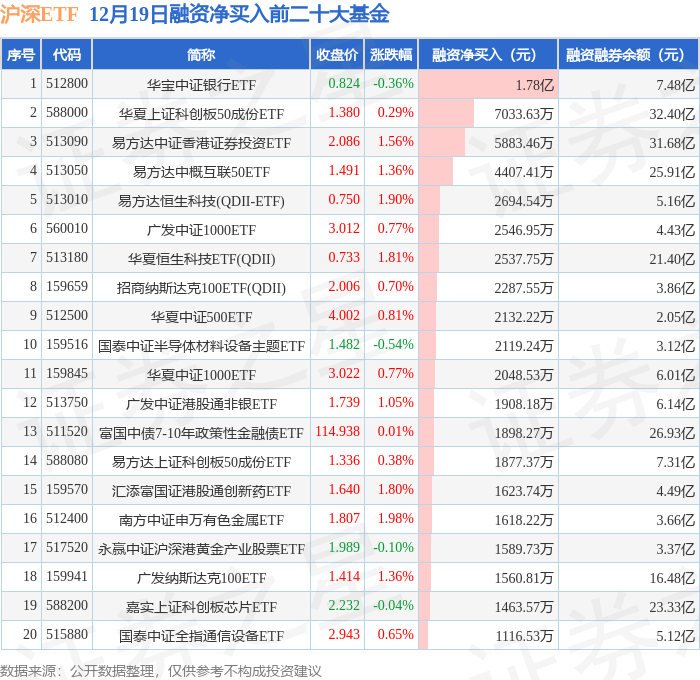 沪深ETF融资净买入前三分别为:华宝中证银行ETF(512800)融资净买入1.78亿元、华夏上证科创板50成份ETF(588000)融资净买入7033.63万元、易方达中证香港证券投资ETF(513090)融资净买入5883.46万元,前20具体见下表: