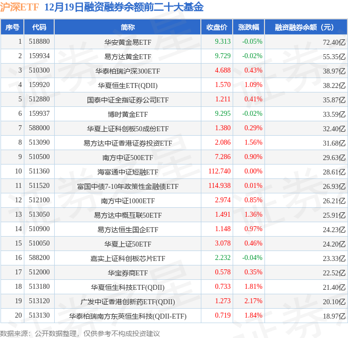 沪深ETF融资融券余额前三分别为:华安黄金易ETF(518880)融资融券余额72.4亿元、易方达黄金ETF(159934)融资融券余额55.35亿元、华泰柏瑞沪深300ETF(510300)融资融券余额38.97亿元,前20具体见下表: