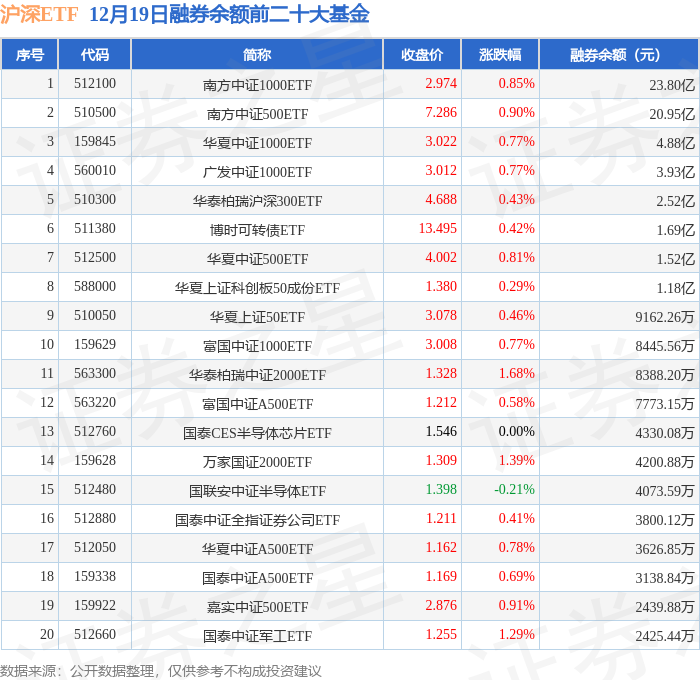 沪深ETF融券余额前三分别为:南方中证1000ETF(512100)融券余额23.8亿元、南方中证500ETF(510500)融券余额20.95亿元、华夏中证1000ETF(159845)融券余额4.88亿元,前20具体见下表: