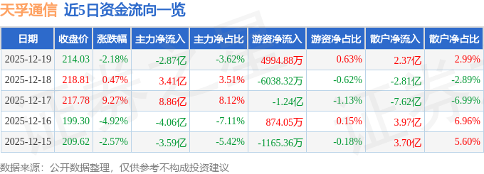 证券之星消息,截至2025年12月19日收盘,天孚通信(300394)报收于214.03元,下跌2.18%,换手率4.73%,成交量36.71万手,成交额79.14亿元。