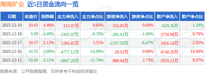12月19日的资金流向数据方面,主力资金净流入313.31万元,占总成交额0.6%,游资资金净流入316.05万元,占总成交额0.6%,散户资金净流出629.36万元,占总成交额1.2%。