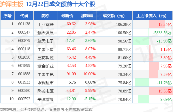 当日沪深主板成交额前10大个股中7只个股收涨,平均涨幅6.22%,其中工业富联(601138)以成交额106.28亿元排第一。从主力资金流入看,成交额前10大个股中有6只个股呈现主力资金净流入。