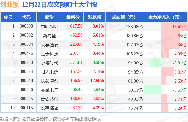 当日创业板成交额前10大个股中8只个股收涨,平均涨幅5.5%,其中中际旭创(300308)以成交额238.98亿元排第一。从主力资金流入看,成交额前10大个股中有8只个股呈现主力资金净流入。