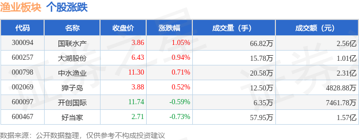 证券之星消息,12月22日渔业板块较上一交易日上涨0.34%,国联水产领涨。当日上证指数报收于3917.36,上涨0.69%。深证成指报收于13332.73,上涨1.47%。渔业板块个股涨跌见下表: