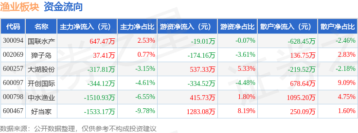 从资金流向上来看,当日渔业板块主力资金净流出3021.16万元,游资资金净流入1708.45万元,散户资金净流入1312.71万元。渔业板块个股资金流向见下表: