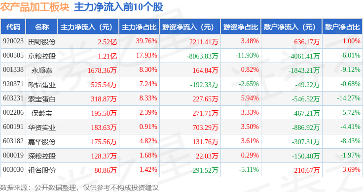 从资金流向上来看,当日农产品加工板块主力资金净流入3297.03万元,游资资金净流出3607.5万元,散户资金净流入310.48万元。农产品加工板块个股资金流向见下表: