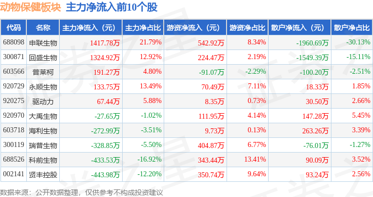 从资金流向上来看,当日动物保健板块主力资金净流出1.39亿元,游资资金净流入5021.79万元,散户资金净流入8897.91万元。动物保健板块个股资金流向见下表: