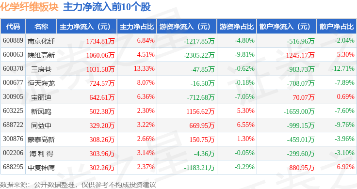 从资金流向上来看,当日化学纤维板块主力资金净流入113.74万元,游资资金净流出7246.62万元,散户资金净流入7132.88万元。化学纤维板块个股资金流向见下表: