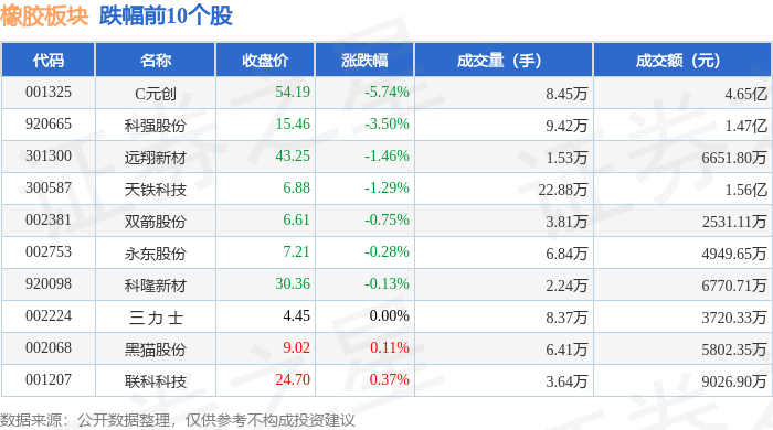 证券之星消息,12月22日橡胶板块较上一交易日上涨1.82%,彤程新材领涨。当日上证指数报收于3917.36,上涨0.69%。深证成指报收于13332.73,上涨1.47%。橡胶板块个股涨跌见下表: