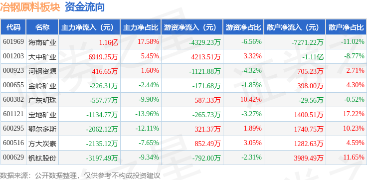 从资金流向上来看,当日冶钢原料板块主力资金净流入9622.76万元,游资资金净流出705.83万元,散户资金净流出8916.92万元。冶钢原料板块个股资金流向见下表: