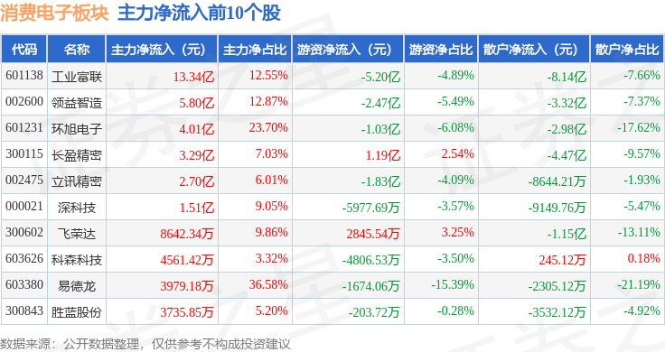 从资金流向上来看,当日消费电子板块主力资金净流入24.31亿元,游资资金净流出5.96亿元,散户资金净流出18.35亿元。消费电子板块个股资金流向见下表: