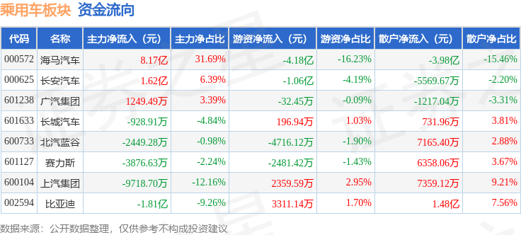 从资金流向上来看,当日乘用车板块主力资金净流入6.4亿元,游资资金净流出5.38亿元,散户资金净流出1.02亿元。乘用车板块个股资金流向见下表: