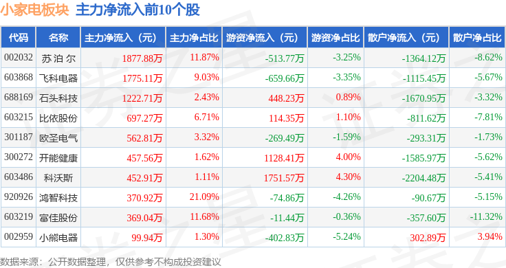 从资金流向上来看,当日小家电板块主力资金净流入1451.64万元,游资资金净流入5934.26万元,散户资金净流出7385.9万元。小家电板块个股资金流向见下表: