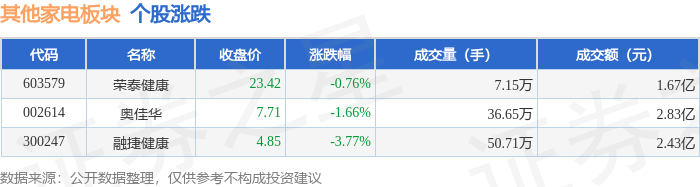 证券之星消息,12月22日其他家电板块较上一交易日下跌2.0%,融捷健康领跌。当日上证指数报收于3917.36,上涨0.69%。深证成指报收于13332.73,上涨1.47%。其他家电板块个股涨跌见下表: