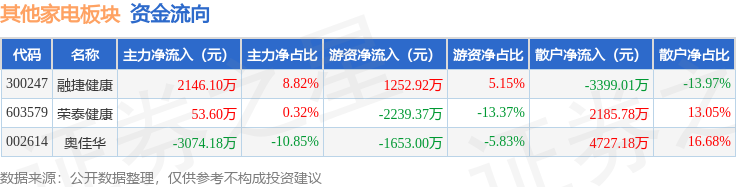从资金流向上来看,当日其他家电板块主力资金净流出874.48万元,游资资金净流出2639.46万元,散户资金净流入3513.94万元。其他家电板块个股资金流向见下表: