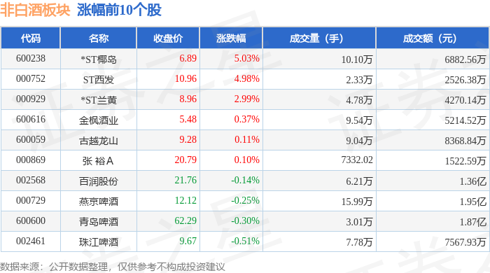 证券之星消息,12月22日非白酒板块较上一交易日下跌0.21%,莫高股份领跌。当日上证指数报收于3917.36,上涨0.69%。深证成指报收于13332.73,上涨1.47%。非白酒板块个股涨跌见下表: