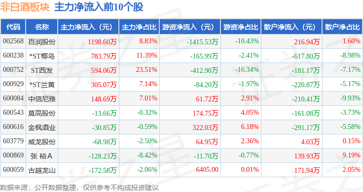 从资金流向上来看,当日非白酒板块主力资金净流出7682.14万元,游资资金净流入1498.85万元,散户资金净流入6183.29万元。非白酒板块个股资金流向见下表: