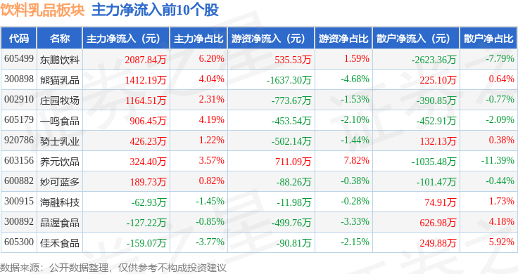 从资金流向上来看,当日饮料乳品板块主力资金净流出2.76亿元,游资资金净流入1.12亿元,散户资金净流入1.64亿元。饮料乳品板块个股资金流向见下表:
