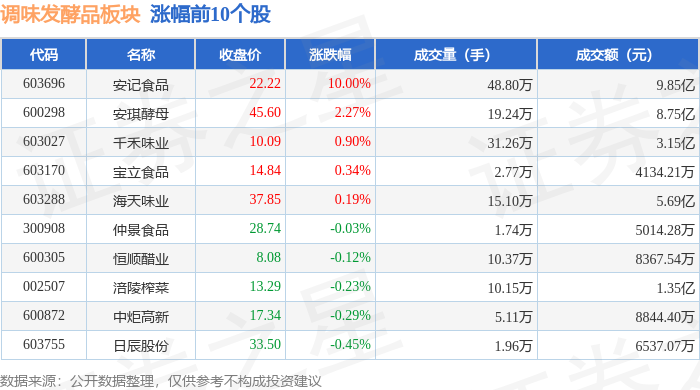 证券之星消息,12月22日调味发酵品板块较上一交易日上涨0.41%,安记食品领涨。当日上证指数报收于3917.36,上涨0.69%。深证成指报收于13332.73,上涨1.47%。调味发酵品板块个股涨跌见下表: