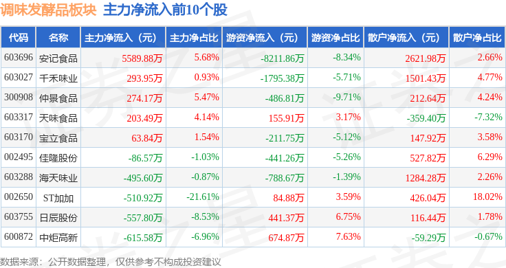 从资金流向上来看,当日调味发酵品板块主力资金净流出4029.27万元,游资资金净流出9886.28万元,散户资金净流入1.39亿元。调味发酵品板块个股资金流向见下表: