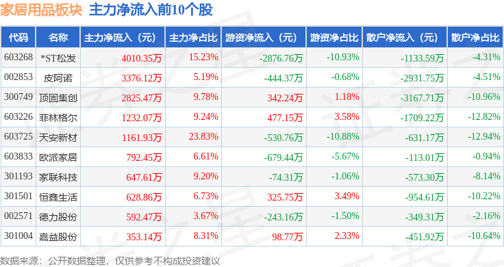 从资金流向上来看,当日家居用品板块主力资金净流出1.62亿元,游资资金净流出1379.63万元,散户资金净流入1.76亿元。家居用品板块个股资金流向见下表:
