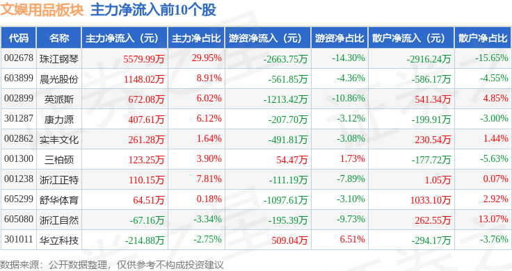从资金流向上来看,当日文娱用品板块主力资金净流出1.19亿元,游资资金净流出4875.9万元,散户资金净流入1.68亿元。文娱用品板块个股资金流向见下表: