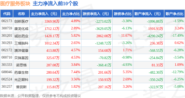 从资金流向上来看,当日医疗服务板块主力资金净流出8.56亿元,游资资金净流入1.85亿元,散户资金净流入6.71亿元。医疗服务板块个股资金流向见下表: