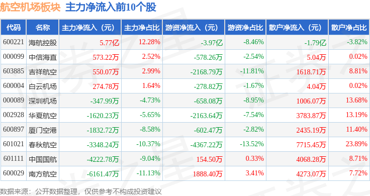 从资金流向上来看,当日航空机场板块主力资金净流入2.18亿元,游资资金净流出5.78亿元,散户资金净流入3.6亿元。航空机场板块个股资金流向见下表: