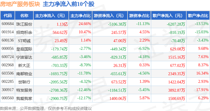 从资金流向上来看,当日房地产服务板块主力资金净流出1.4亿元,游资资金净流出2689.02万元,散户资金净流入1.67亿元。房地产服务板块个股资金流向见下表: